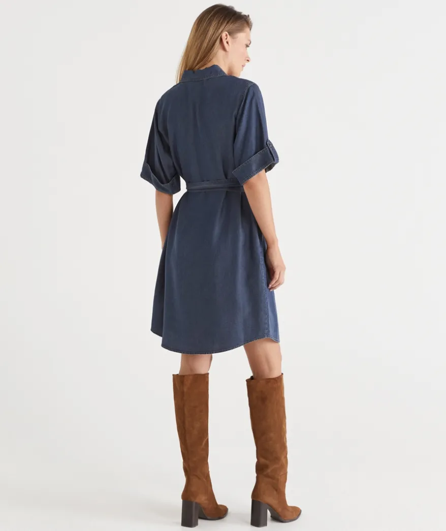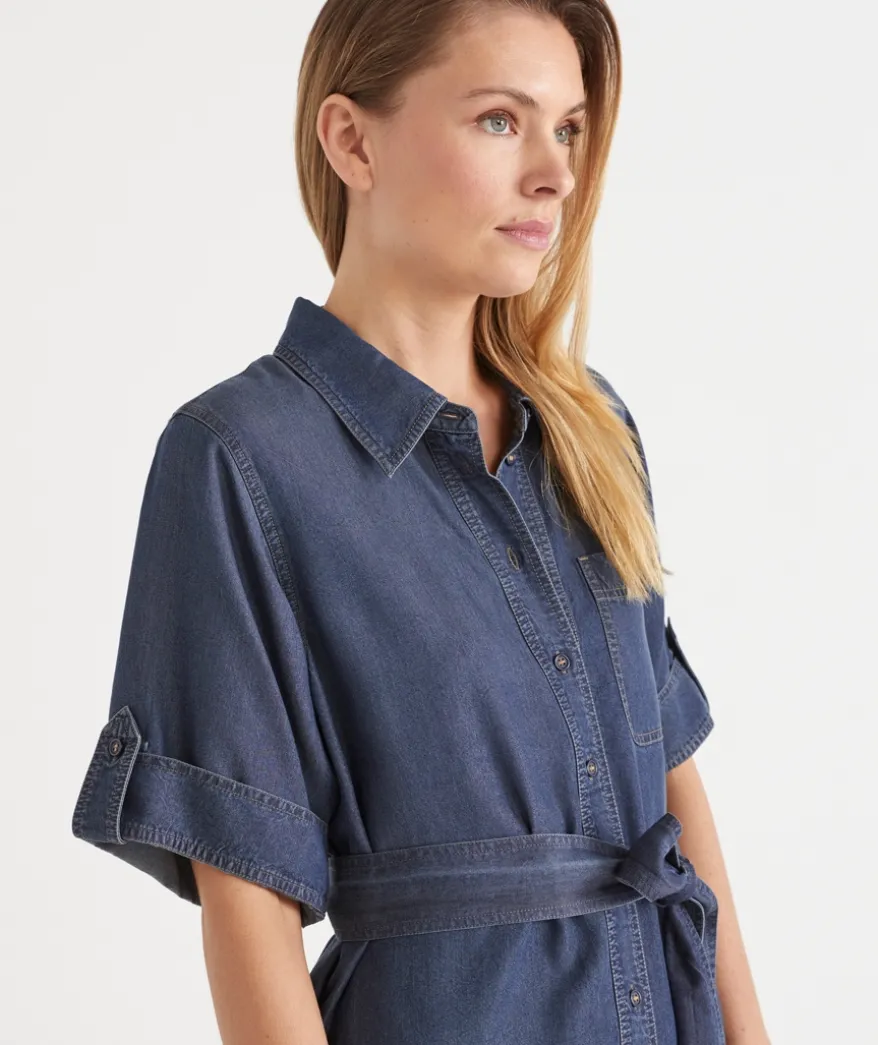 Elevate your wardrobe with our Short Sleeve Belted Shirt Dress. Crafted from soft, breathable lyocell, this dress features a flattering curve hem and a detachable belt for added versatility. Falling just above the knee, this stylish design offers sleeve tabs giving the flexibility to wear up or down. Functional pockets complete the design, making this dress the perfect blend of comfort and style for any occasion.