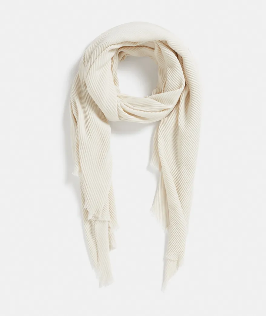 Introducing our Cream Plissé Textured Scarf, designed for effortless layering and timeless sophistication. Crafted from lightweight, pleated fabric, this cover-up drapes beautifully over any outfit, adding texture and movement to your look.