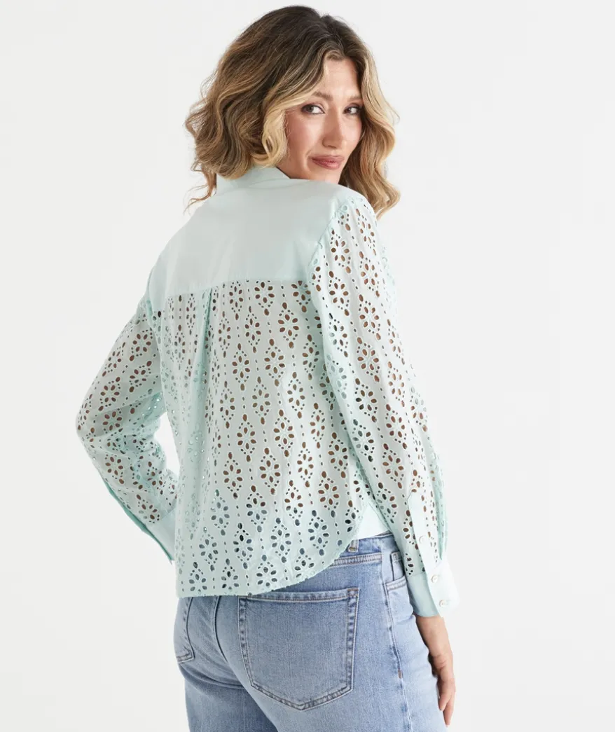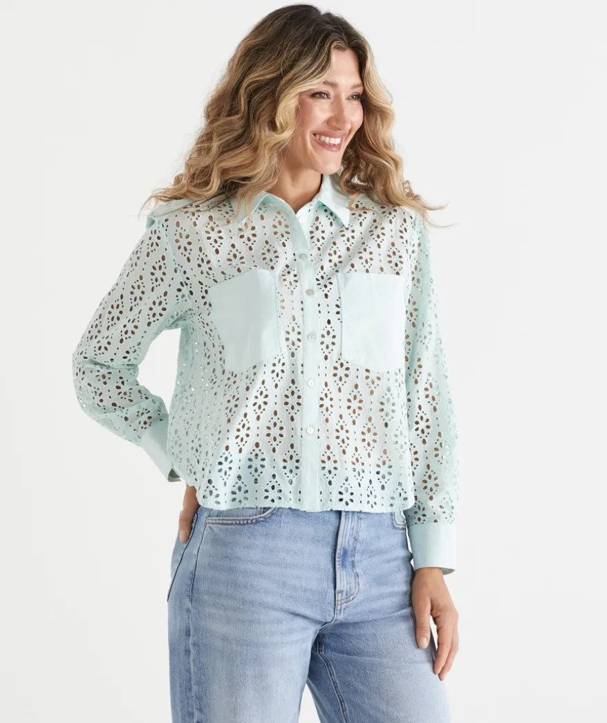 This month’s statement piece, the spearmint Long Sleeve Lace Shirt, combines elegance and style. With long sleeves featuring cuffs, pocket detailing, and a beautiful paisley lace design, it’s a standout addition to your wardrobe. The crop length and scalloped detailing add a modern touch, making this shirt perfect for both casual and dressed up occasions.
