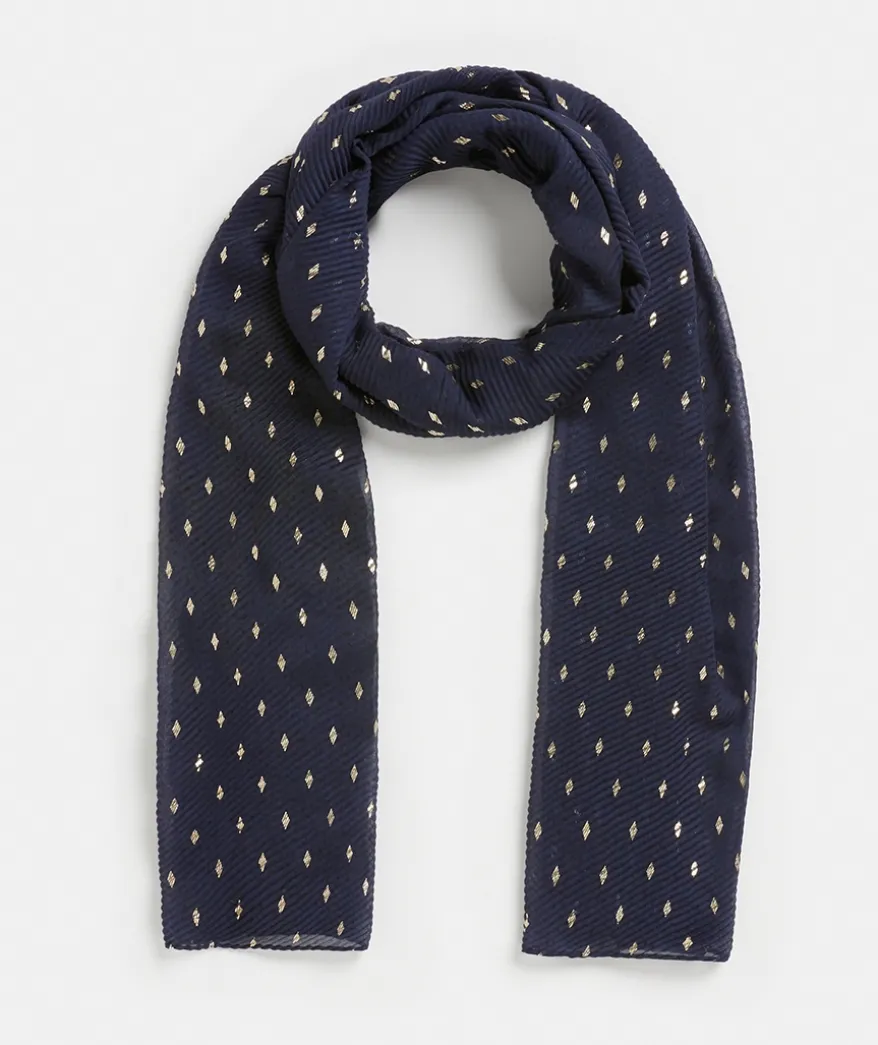 Add a touch of glamour to your wardrobe with the Midnight Foil Spot Plissé Scarf. Featuring a rich midnight hue, this elegant scarf is adorned with delicate gold foil detailing, creating a subtle shimmer with every movement. The lightweight, pleated fabric offers a soft texture and graceful drape, making it perfect for layering over both casual and evening looks. Whether wrapped around the neck, draped over the shoulders, or styled as an accessory, this versatile piece adds effortless sophistication and a hint of sparkle to any outfit.