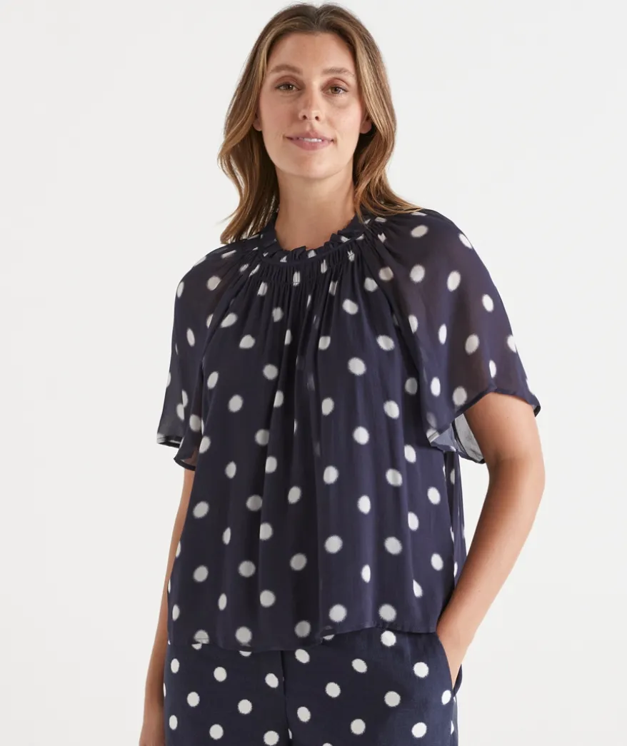 Embrace this seasons must have print with our Polka Dot Gathered Neck Blouse. The sheer viscose creates an effortless drape and movement with every step. A gathered neck and sheer flutter sleeve are perfect feminine touches to a chic, everyday blouse.